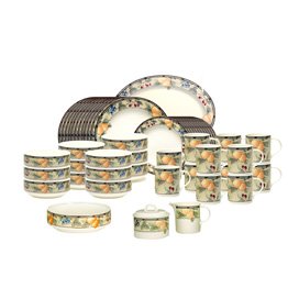 Mikasa Garden Harvest Service for 12 with Serving Accessories OverviewsColorful fruits and leaves enliven the Garden Harvest pattern. This longtime favorite is perfect for everyday use and has a wide array of accessories to create a complete casual dining statement. The pattern coordinates perfectly with casual stemware and flatware to create an ideal everyday tablesetting. Dishwasher, oven, freezer, and microwave-safe. This Service for 12 with Serving Accessories, includes (12) each: 11-1/2 inch dinner plate, 8-1/2 inch salad plate, 30-ounce cereal bowl, and 15-ounce mug, plus a 60 ounce vegetable bowl, 15 inch long platter, 11 ounce covered sugar bowl and 9 ounce creamer.